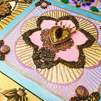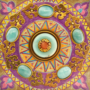 Welcome to my Fall 2023 Blog -- There's so much to share! Firstly, I'm so very excited to introduce my latest art installation called Kaleidoscopics - Jewelry for your walls. These are 50 original, one-of-a-kind 3D collages featuring ornate acrylic painting and brass stampings topped with semi-precious or colored cabochons. All the elements are fastened onto a 6-inch square wooden tile with metal rivets or artist’s cement.